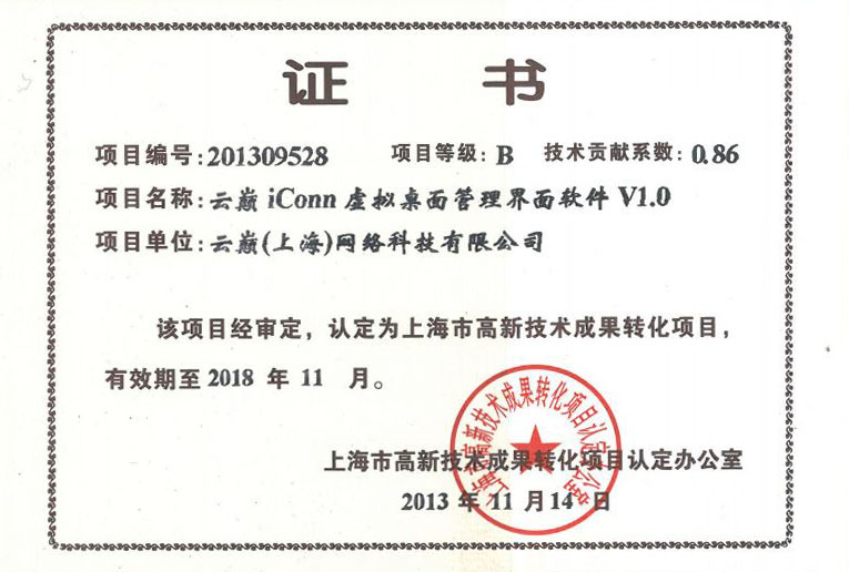 2013年云巅iConn获得上海市高新技术成果转化项目认定