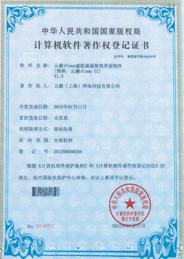 2012年获得国家版权局认证的云巅iConn云桌面著作权