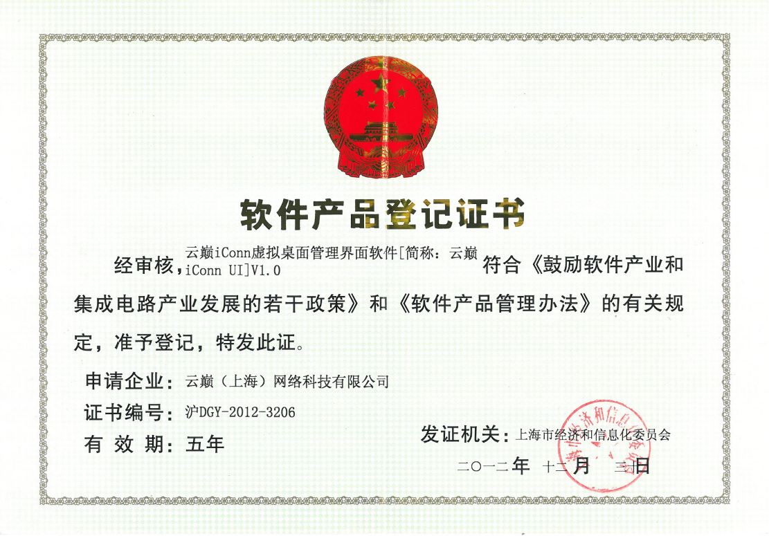 2012年云巅iConn云桌面由上海市经济和信息化委员会认定为软件产品